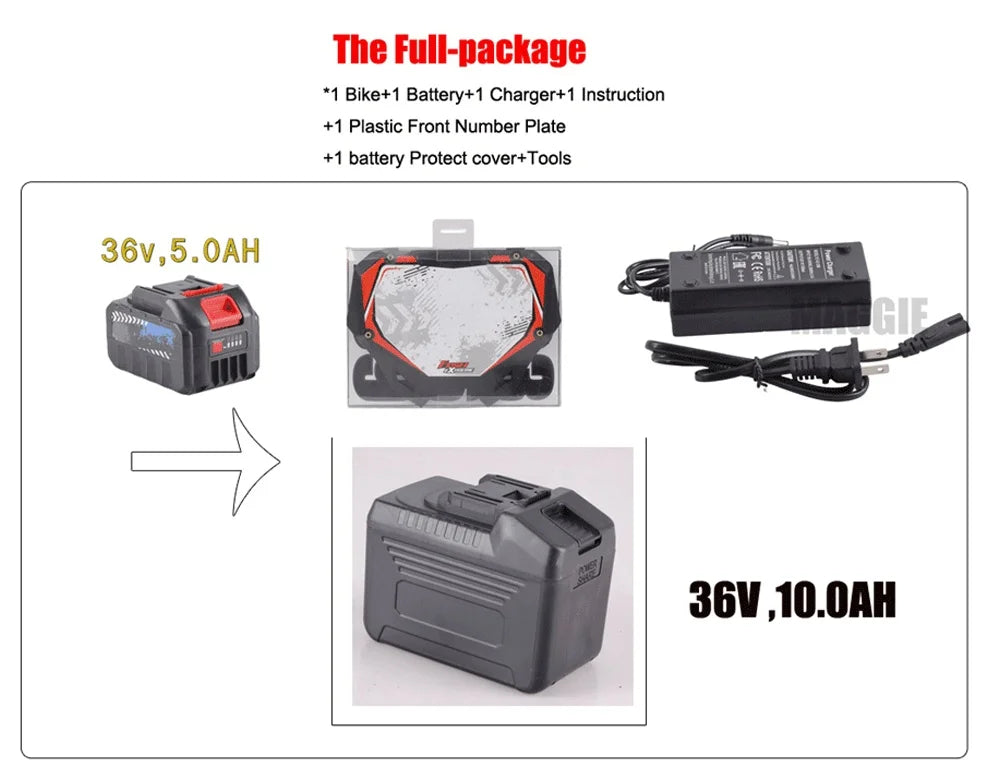 1 Bike+1 Battery+1 Charger+1 Instruction+1 Plastic Front Number Plate+1 battery Protect cover+Tools